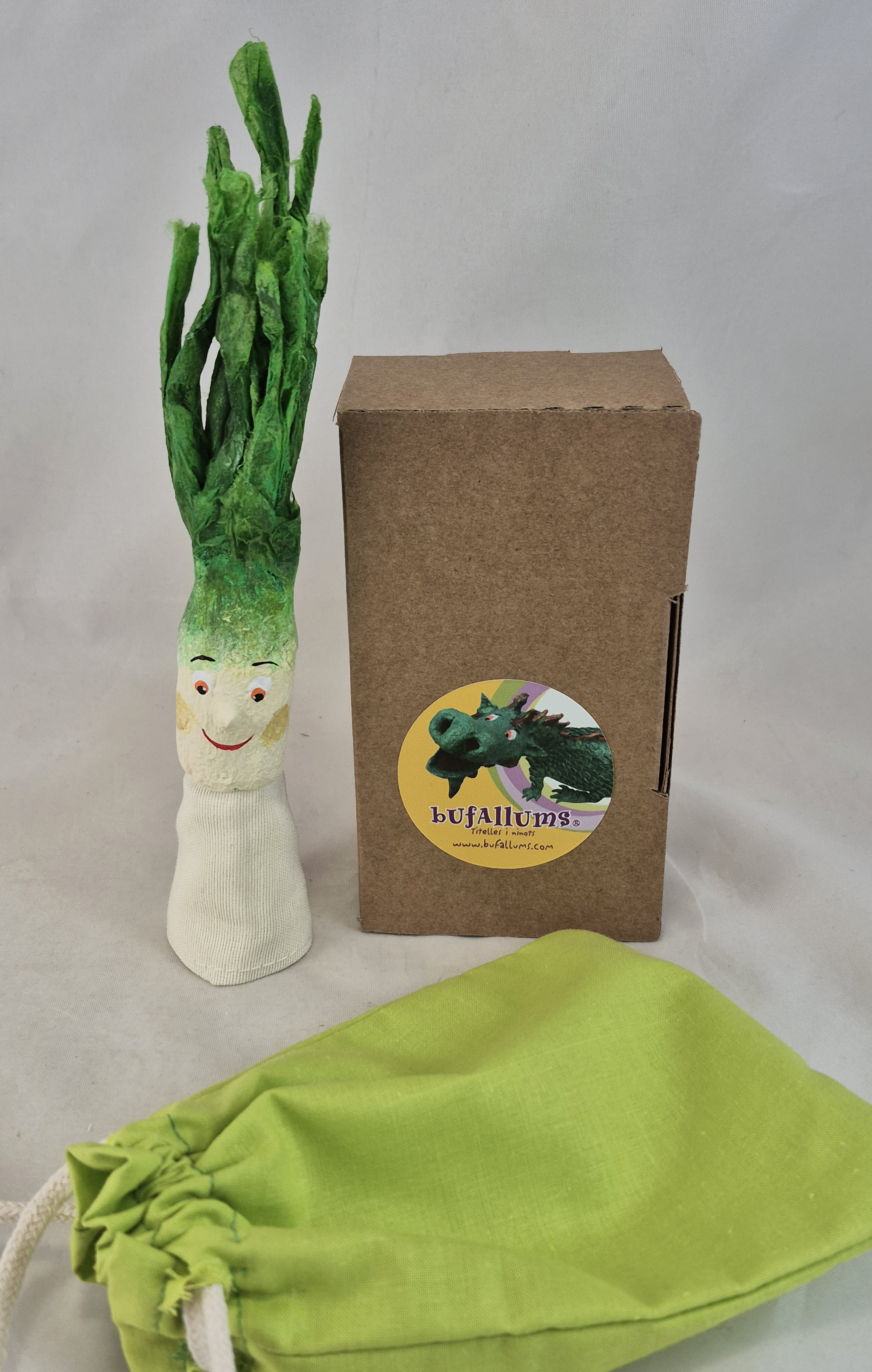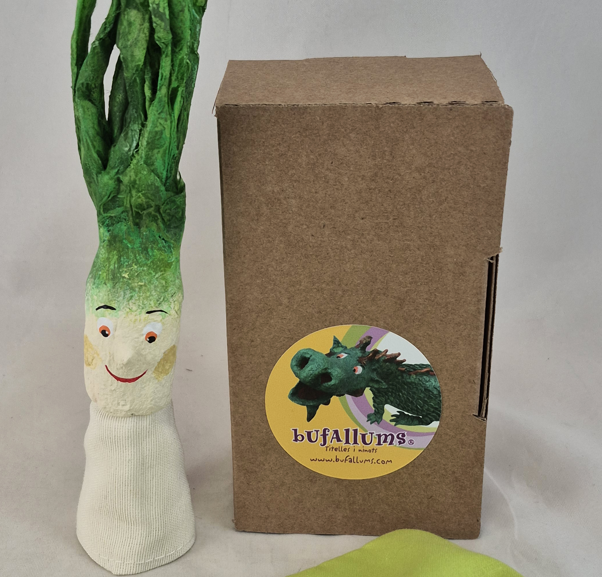 Aquest titella de dit Calçot, d'aproximadament 10 cm, és ideal per crear narracions imaginatives inspirades en les calçotades i la tradició gastronòmica catalana. Inclou una capsa de cartró (7x14x5 cm) i una pràctica bosseta de tela per guardar-lo després de cada sessió de joc.