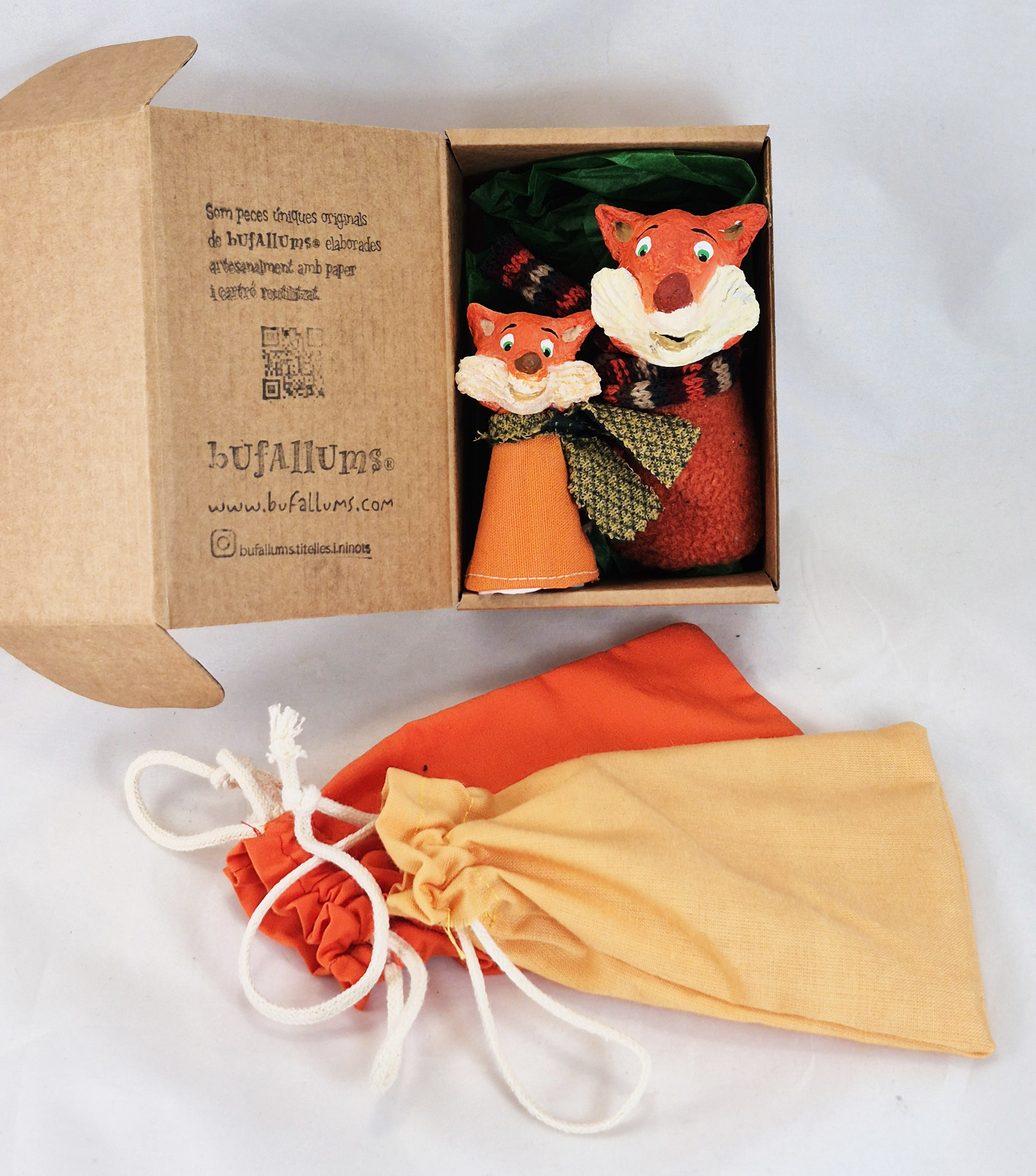 Els titelles són una interpretació pròpia i tendra, no una reproducció exacta del llibre. Han estat creats artesanalment amb materials sostenibles i representen aquests dos germans amb personalitat única. Cada peça està feta a mà i pot presentar petites variacions respecte a la fotografia, un valor afegit que les fa encara més especials. Es presenten dins d’una capsa artesanal i acompanyats d’una bossa de tela per guardar-los i conservar-los amb cura.