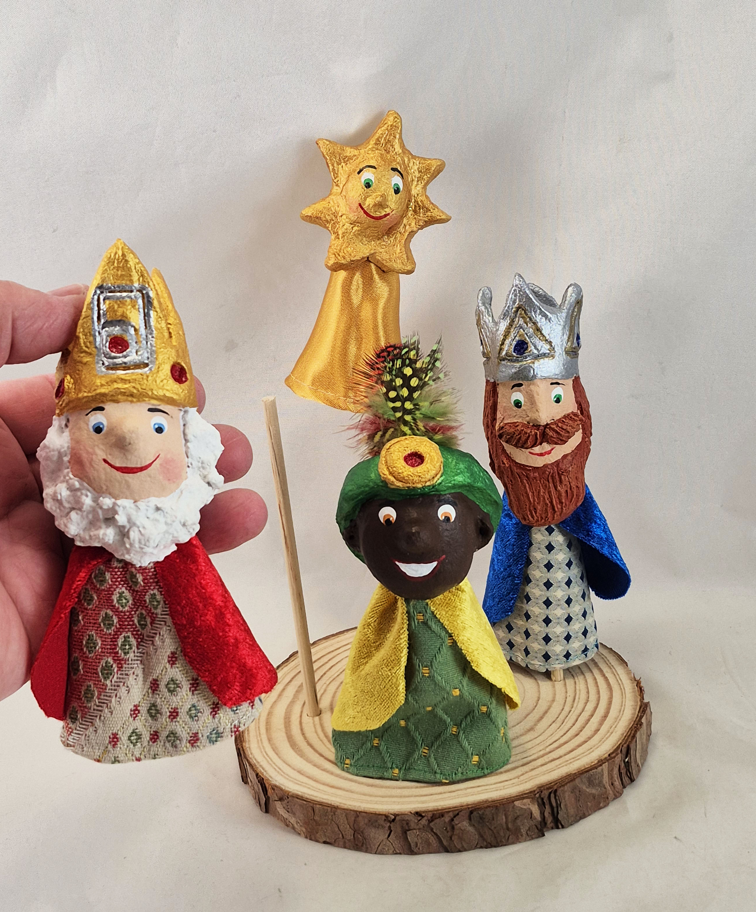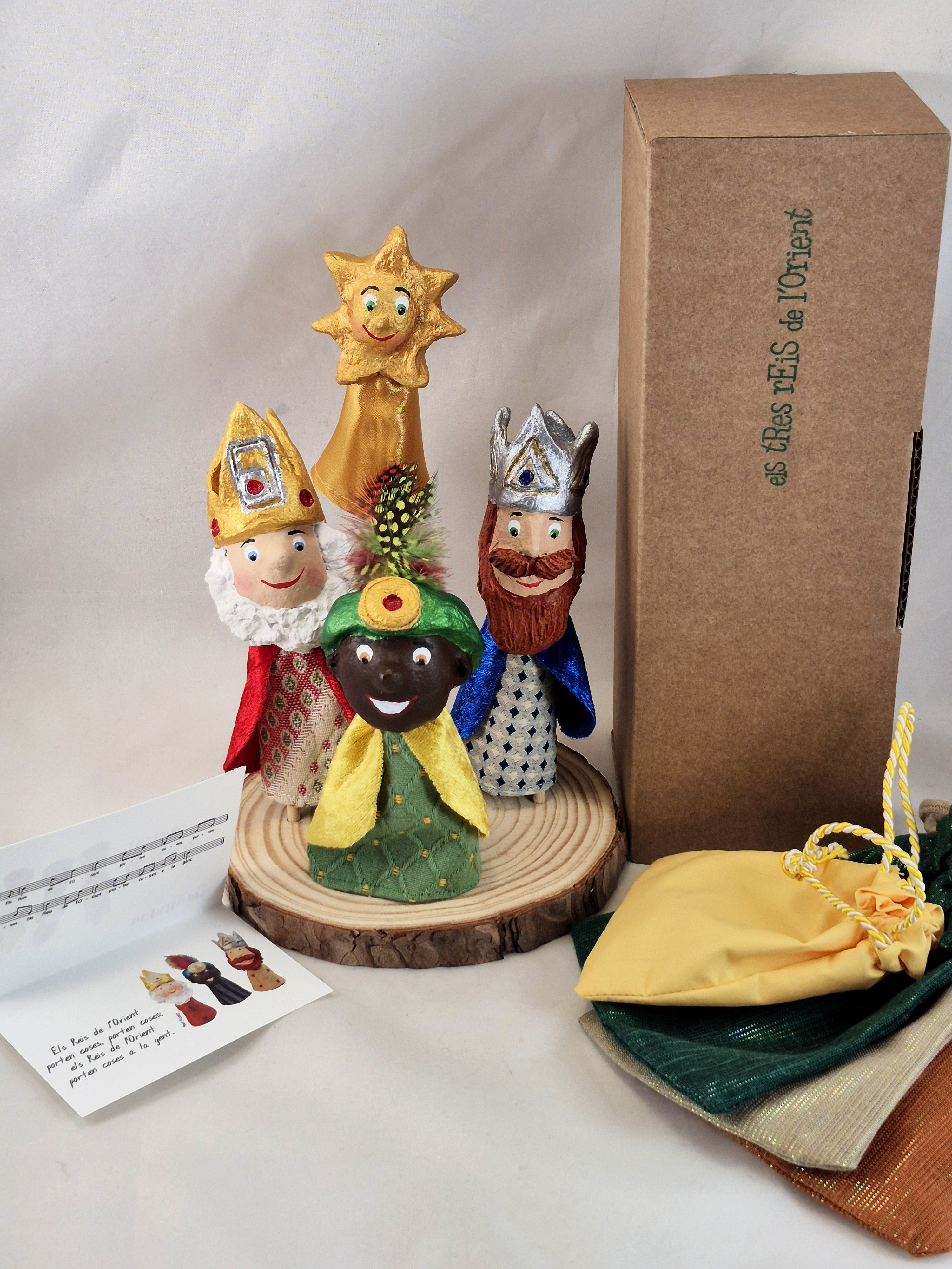 Melcior, Gaspar i Baltasar arriben en forma de titelles de dit, acompanyades de l’Estrella que els guia, per portar llum, tradició i un toc de màgia nadalenca a qualsevol proposta de joc o narració.