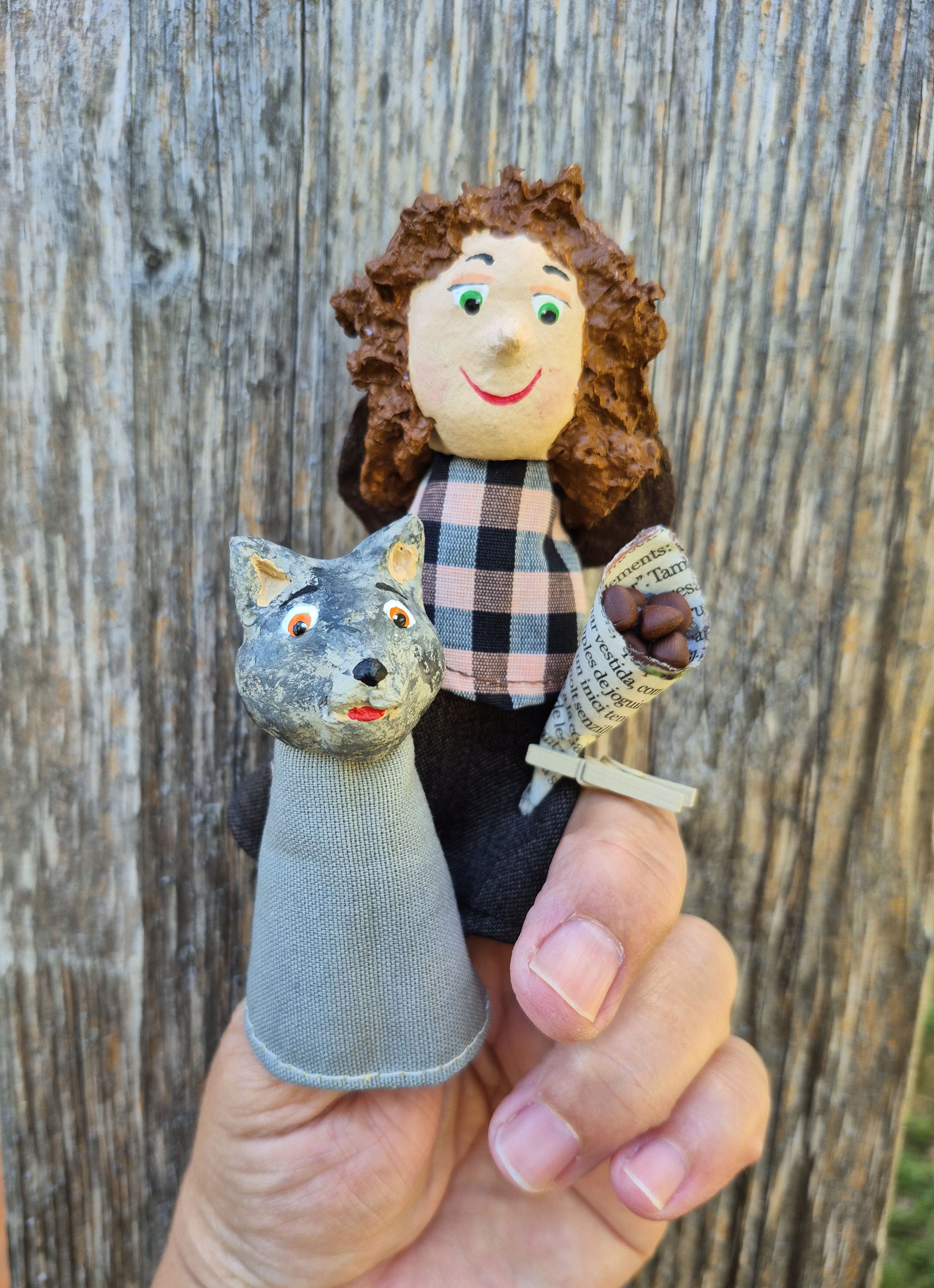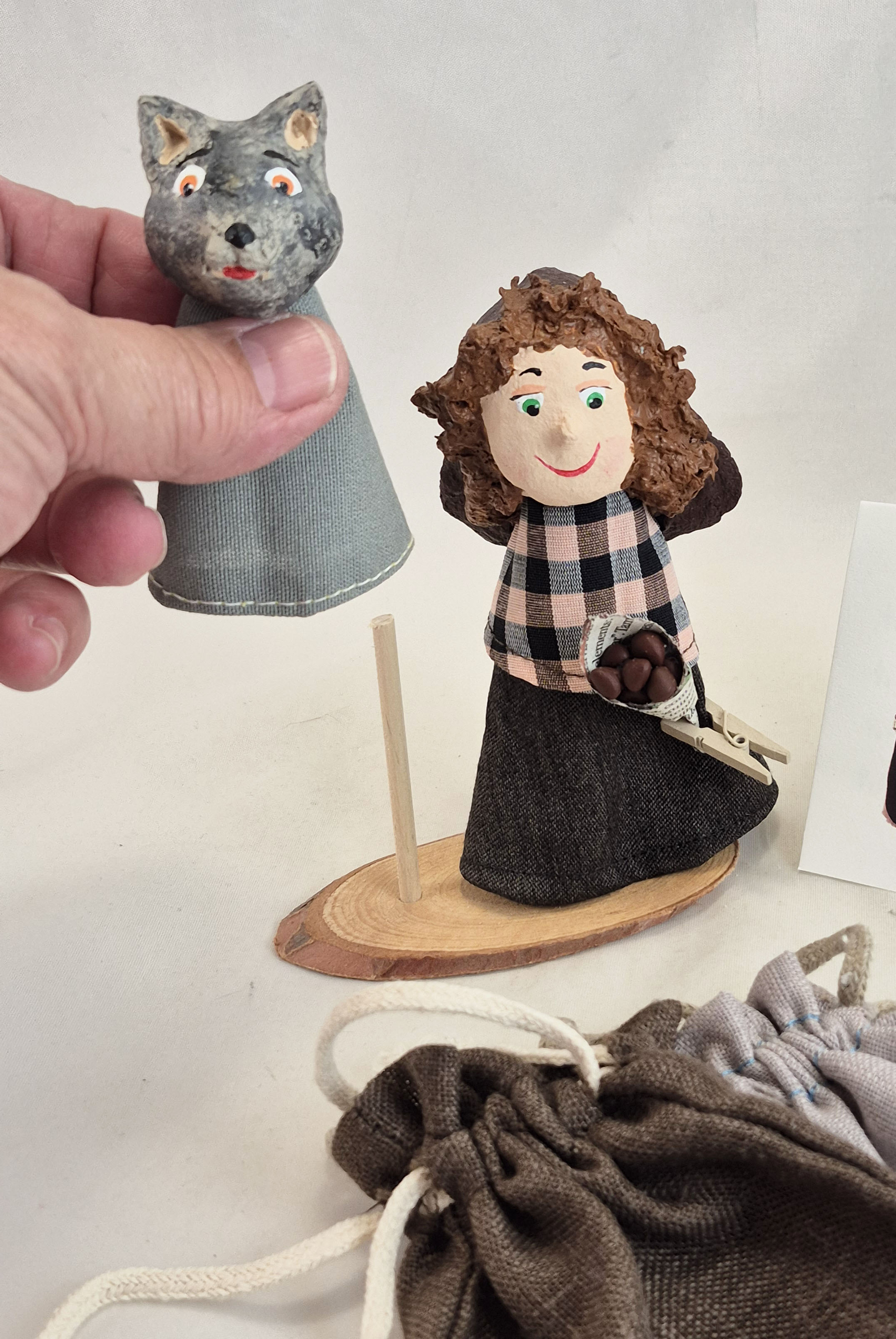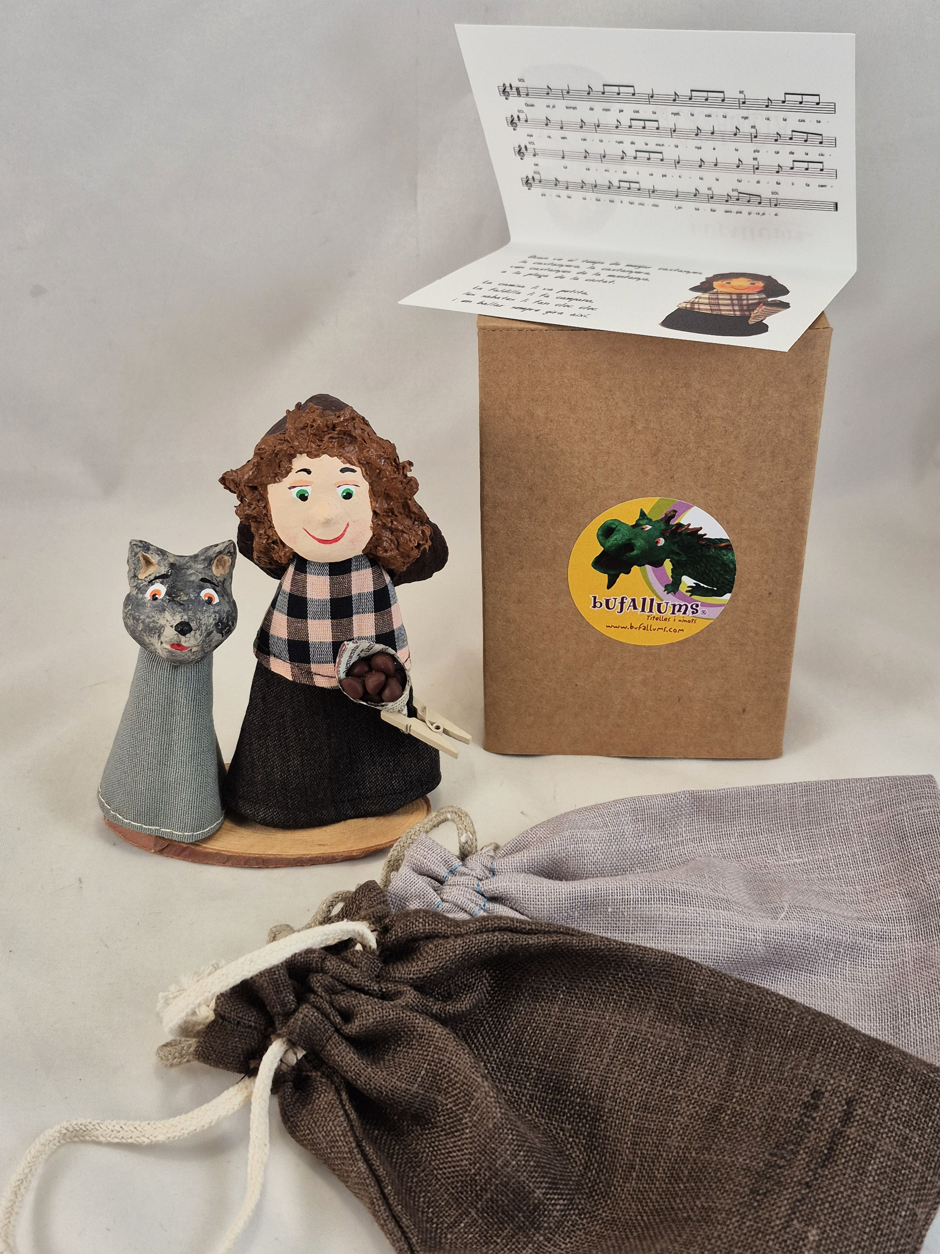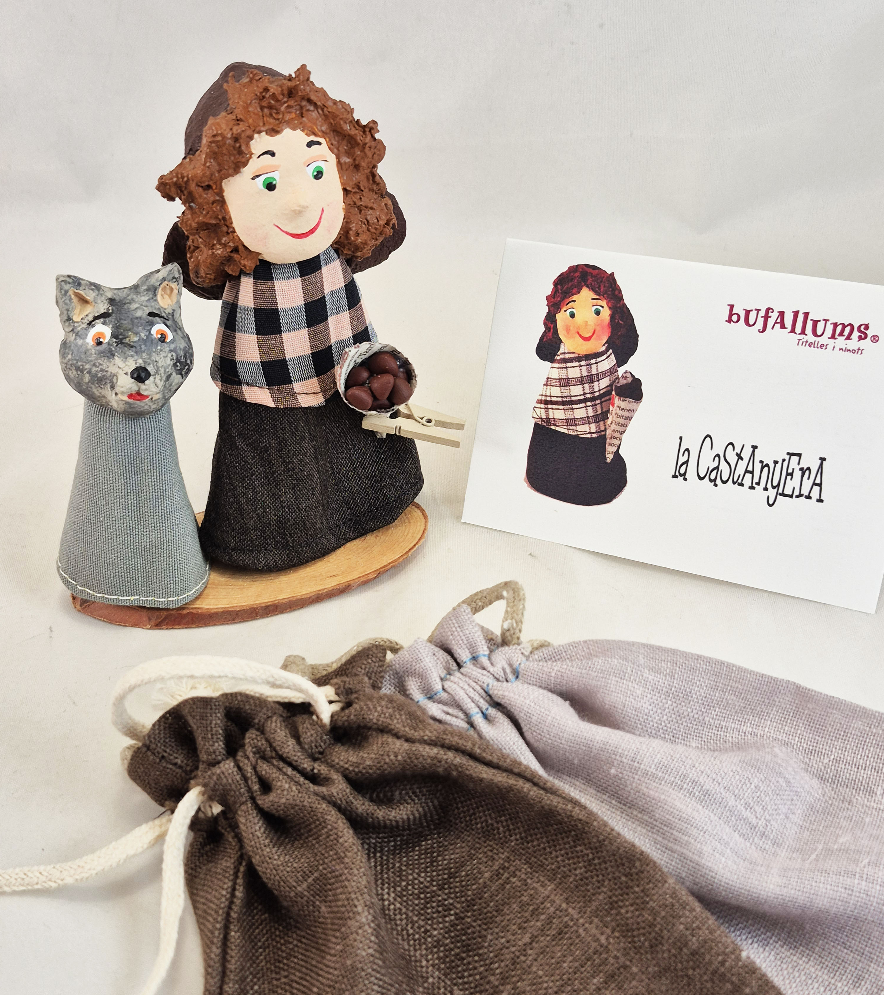 Amb aquest conjunt de titelles de dit, podràs cantar les cançons populars de tardor i explicar el conte de Maria, la Castanyera, un personatge entranyable que forma part de la Castanyada, envoltada de fulles i castanyes que anuncien la tardor.
