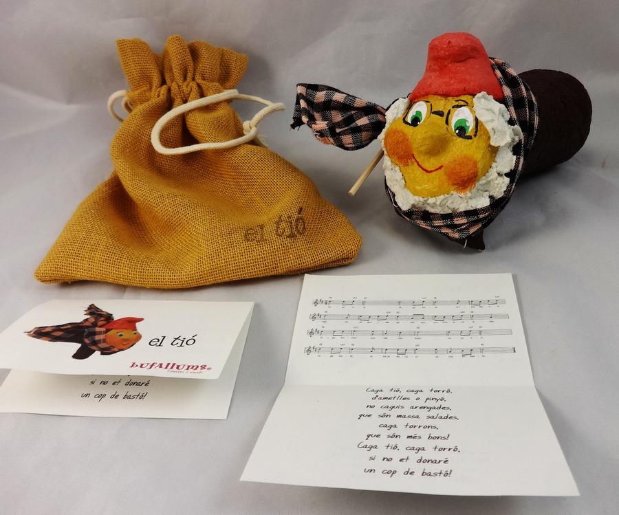 És un TIÓ AVI de paper i cartró reciclat. És molt resistent. El podeu picar amb un bastó perquè us "cagui" moltes coses, ara bé, li heu de donar moltes mandarines que li encanten!!