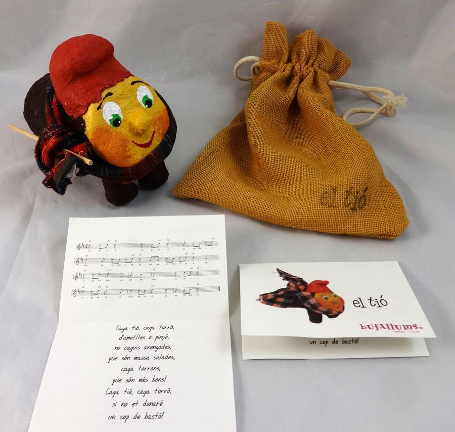 La figura medeix 12 cm de llarg X 6 cm d'ample. Porta el text i partitura de la cançó, la manteta i la bossa de sac per a guardar-lo!