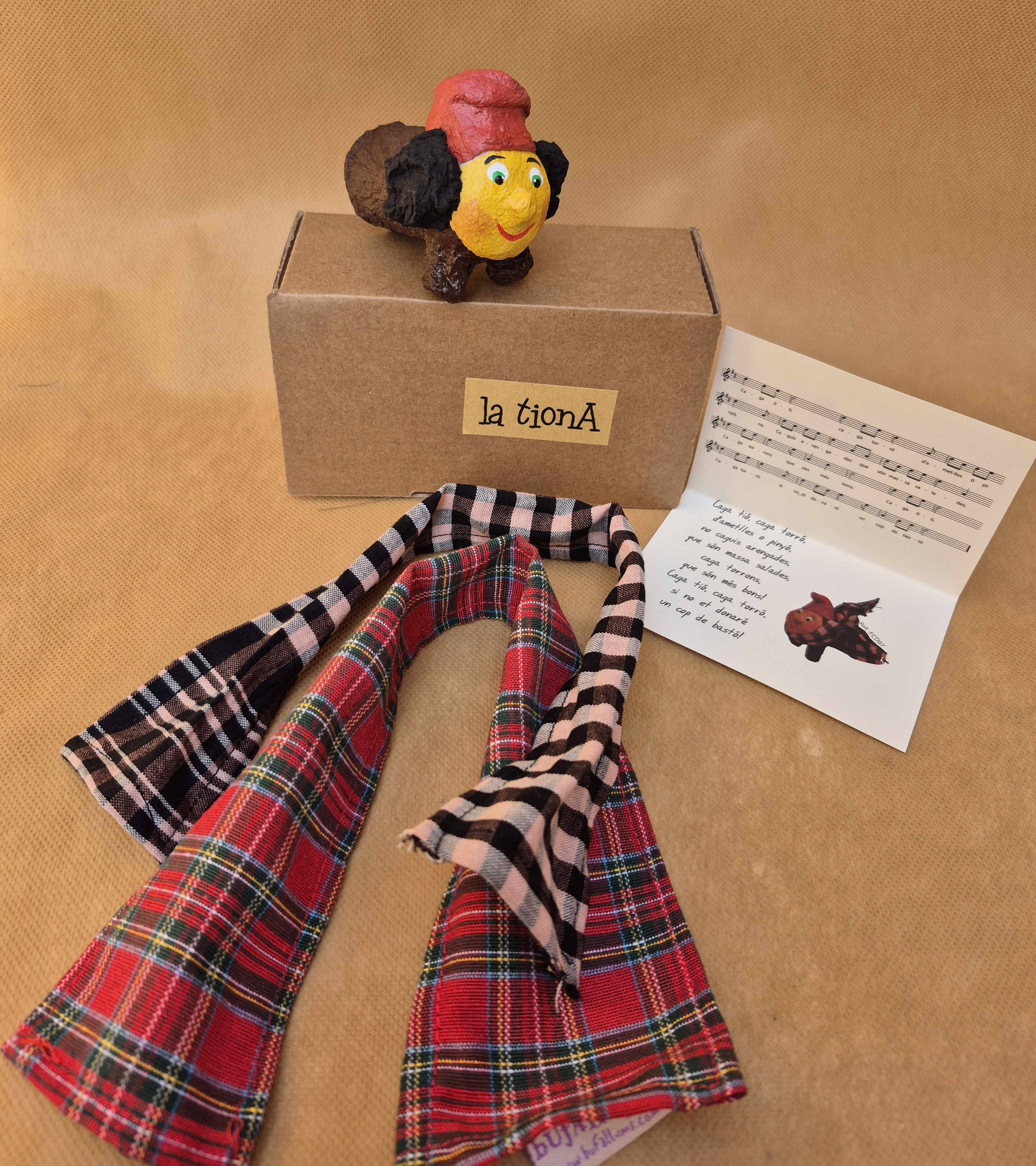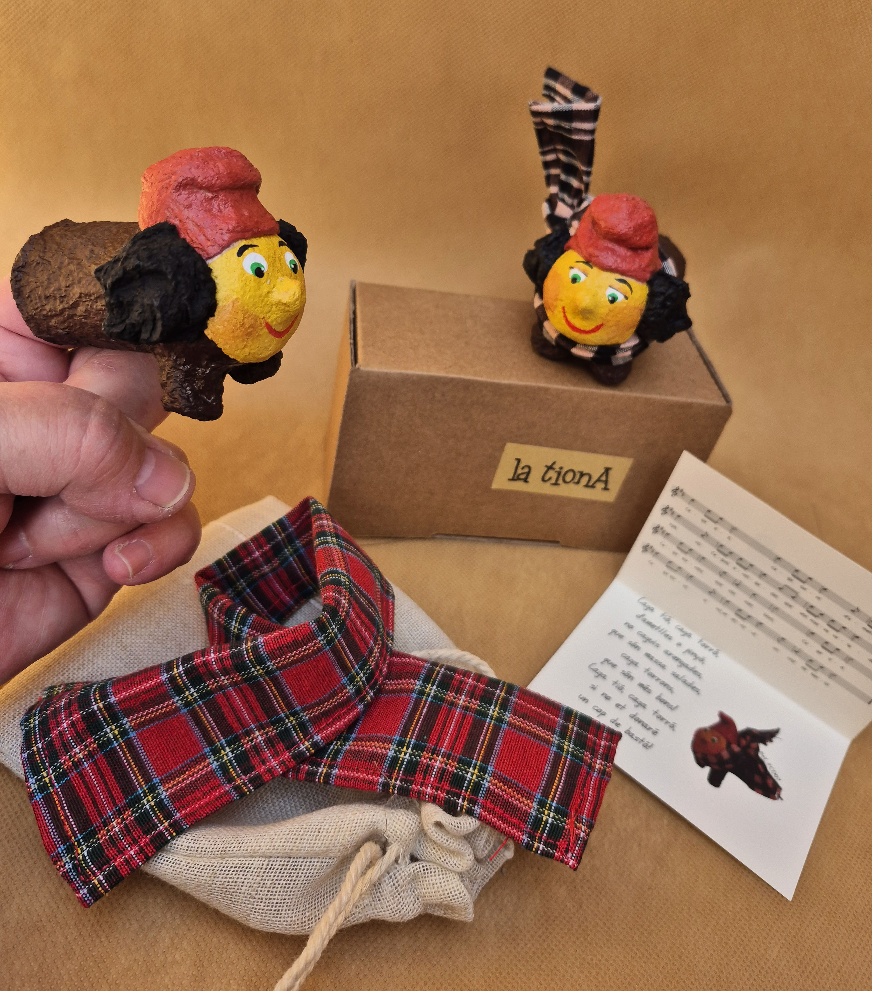 Una Tiona petita i preciosa, transformada en titella de dit i modelada completament amb pasta de paper. Porta bufandeta i bosseta de tela. Una companya entranyable per acompanyar les criatures en moments de joc, cantar cançons nadalenques i viure la màgia del Nadal d’una manera propera, alegre i divertida.