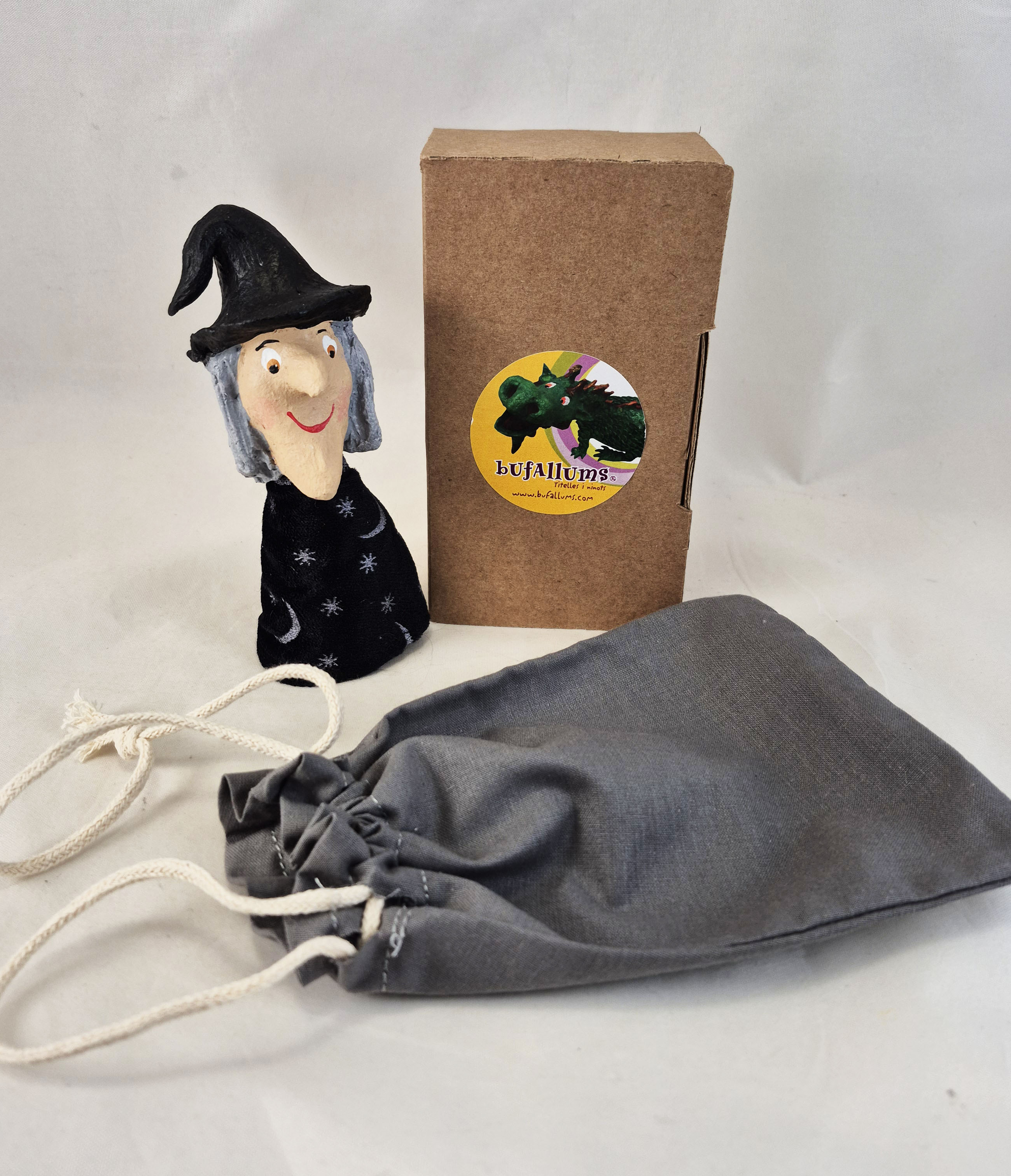 Aquest titella de dit BRUIXA, d’uns 8 cm d’alçada, és perfecte per inventar històries màgiques, trapelleres i plenes de fantasia. Amb el seu barret punxegut i mirada espavilada, pot ser la protagonista d’encanteris divertits, pocions imaginatives o aventures amb calderes misterioses.