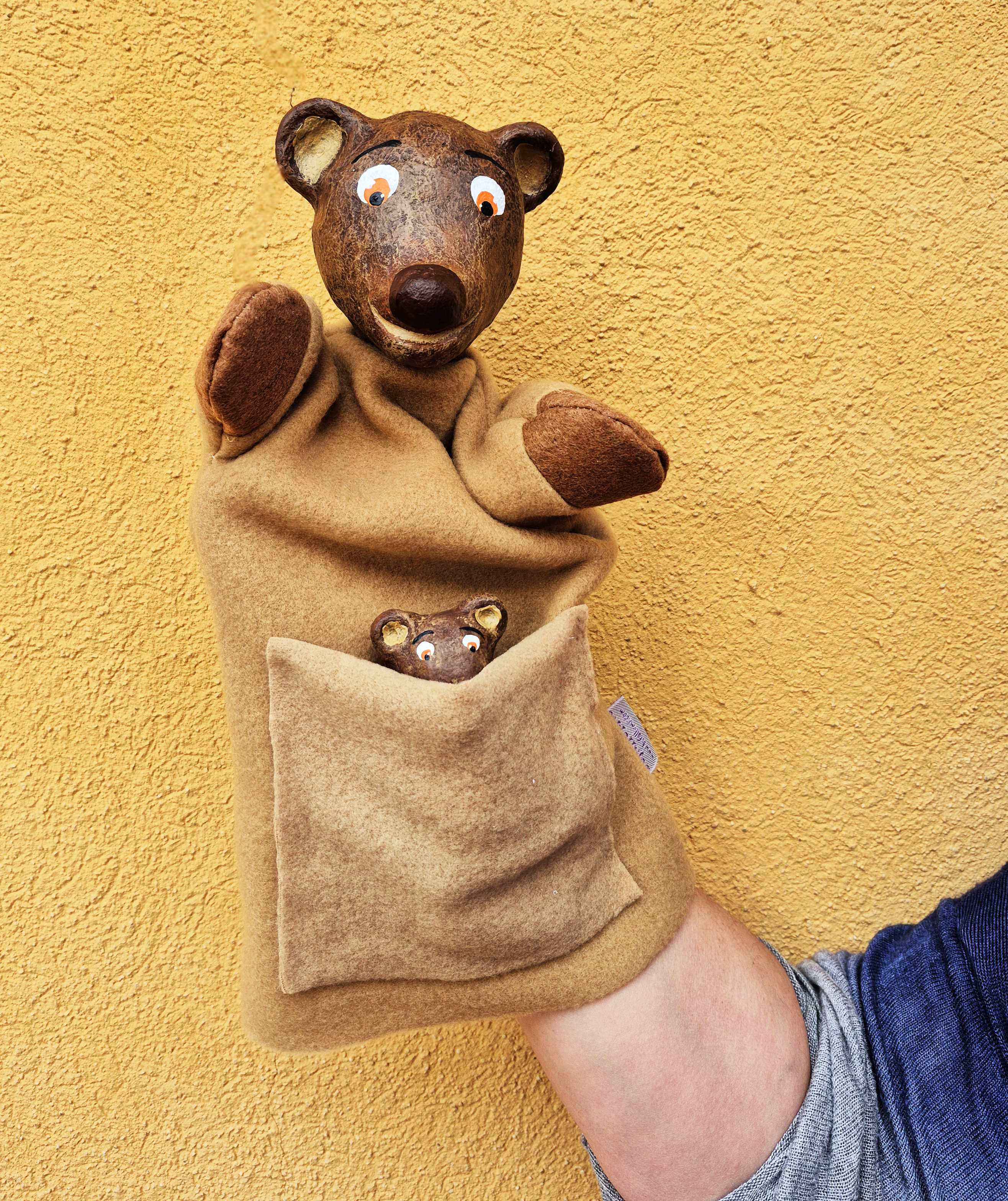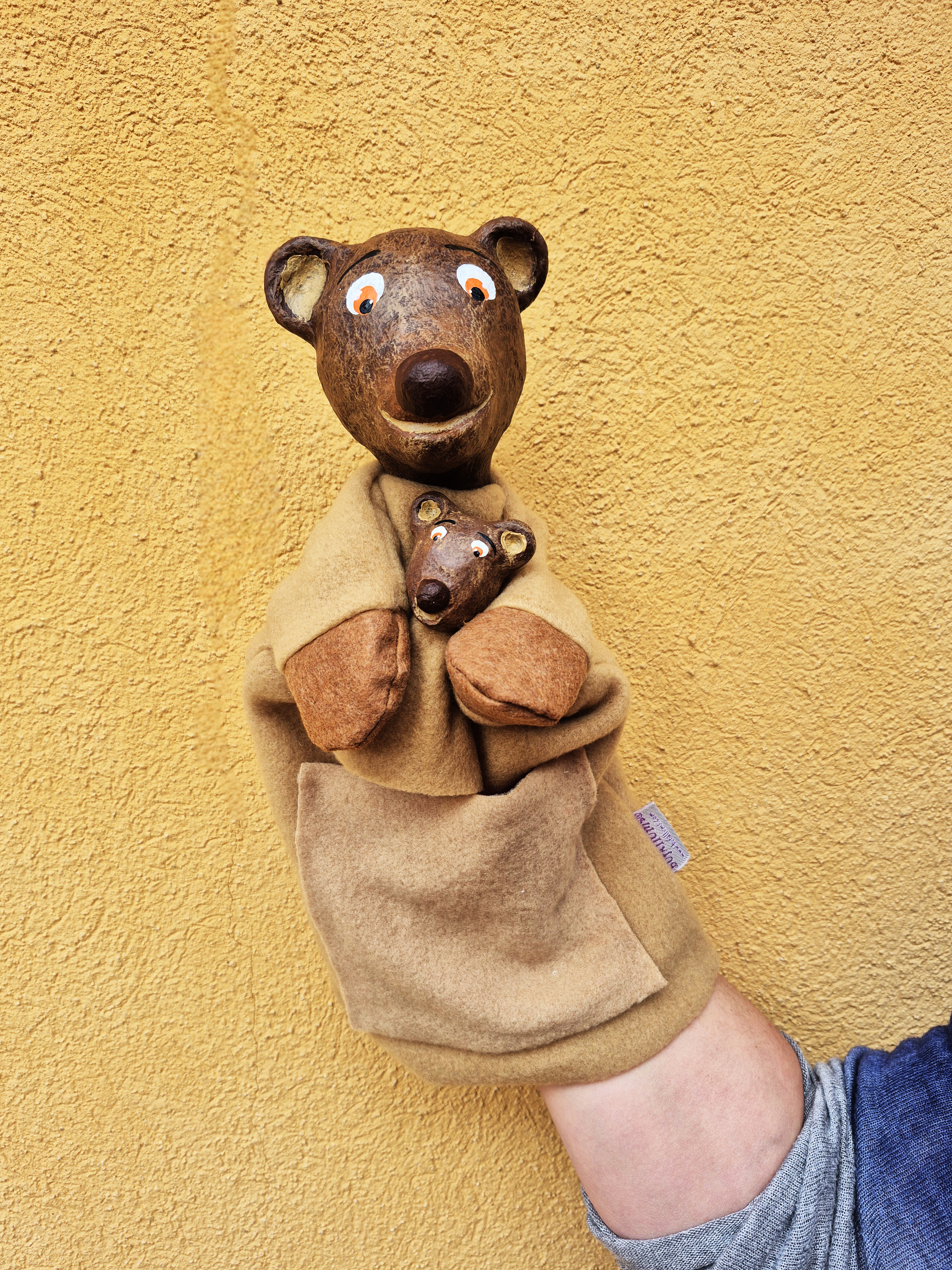 Aquest conjunt combina una titella de mà amb una titella de dit, dues mides que permeten jugar amb el diàleg, la cura i la complicitat entre personatges. L’ossa pot abraçar, escoltar o explicar el conte… mentre el petit os s’hi acosta, curiós i juganer.