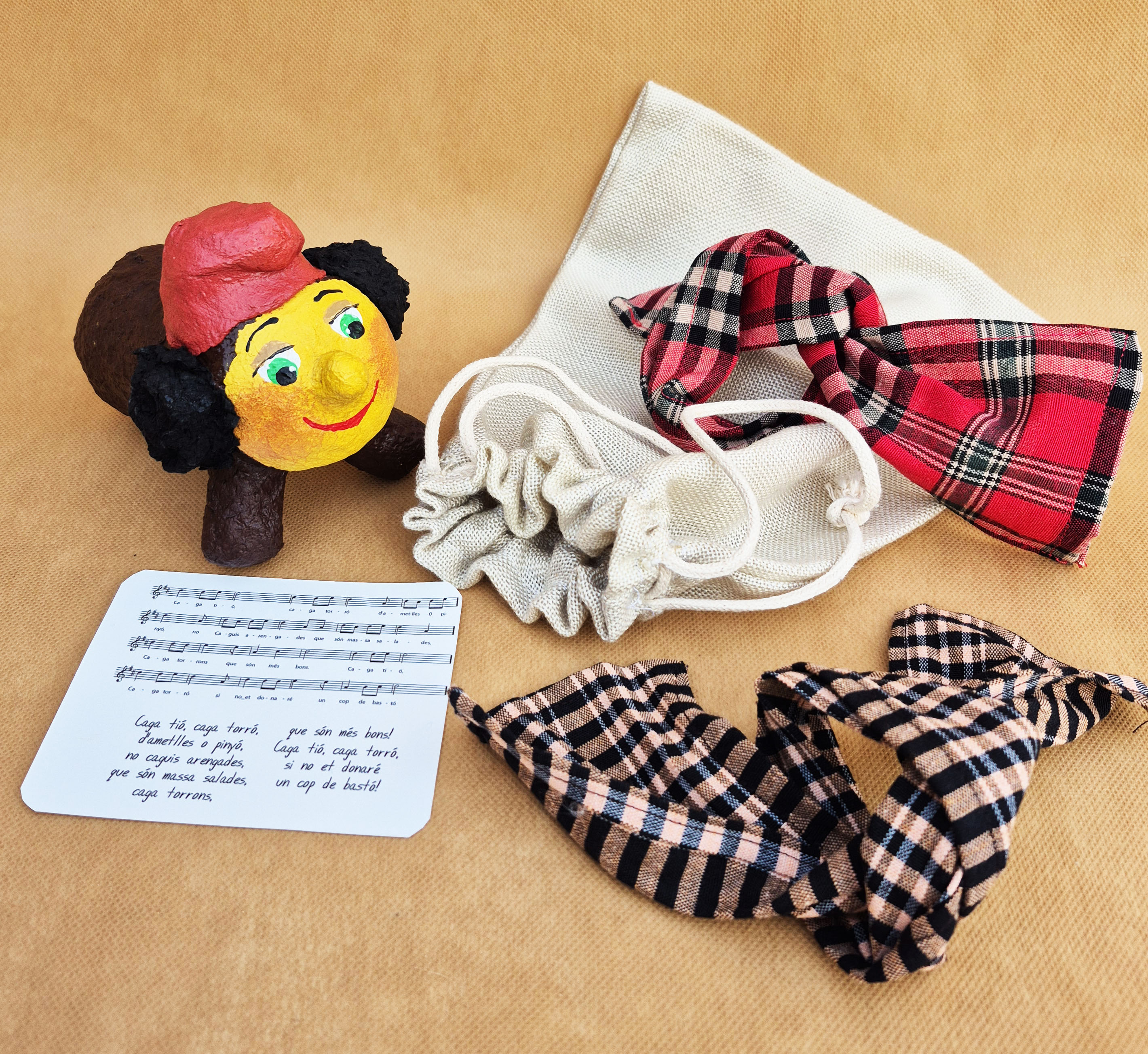 Una Tiona amb cuetes, petita i entranyable, feta totalment de pasta de paper. Porta dues bufandetes intercanviables i bosseta de tela per guardar-la i transportar-la. Un personatge dolç i proper, perfecte per cantar cançons, inventar històries o decorar racons nadalencs.