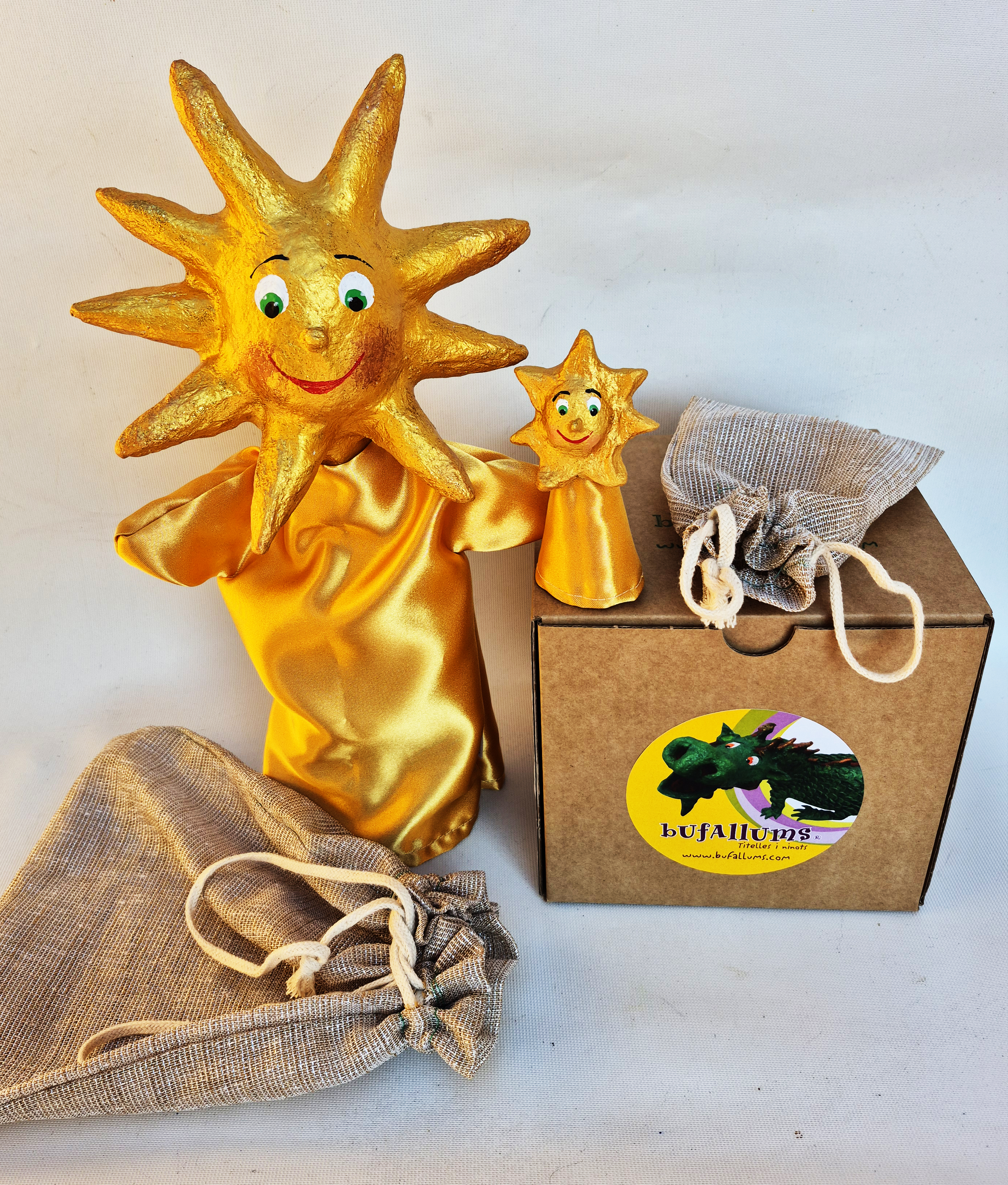Elaborado artesanalmente con pasta de papel reutilizado, siguiendo la técnica propia de Bufallums. Cada títere es una pieza única, hecha a mano y sin molde, por lo que puede presentar pequeñas variaciones respecto a la fotografía: una muestra auténtica de su valor artesanal y sostenible.