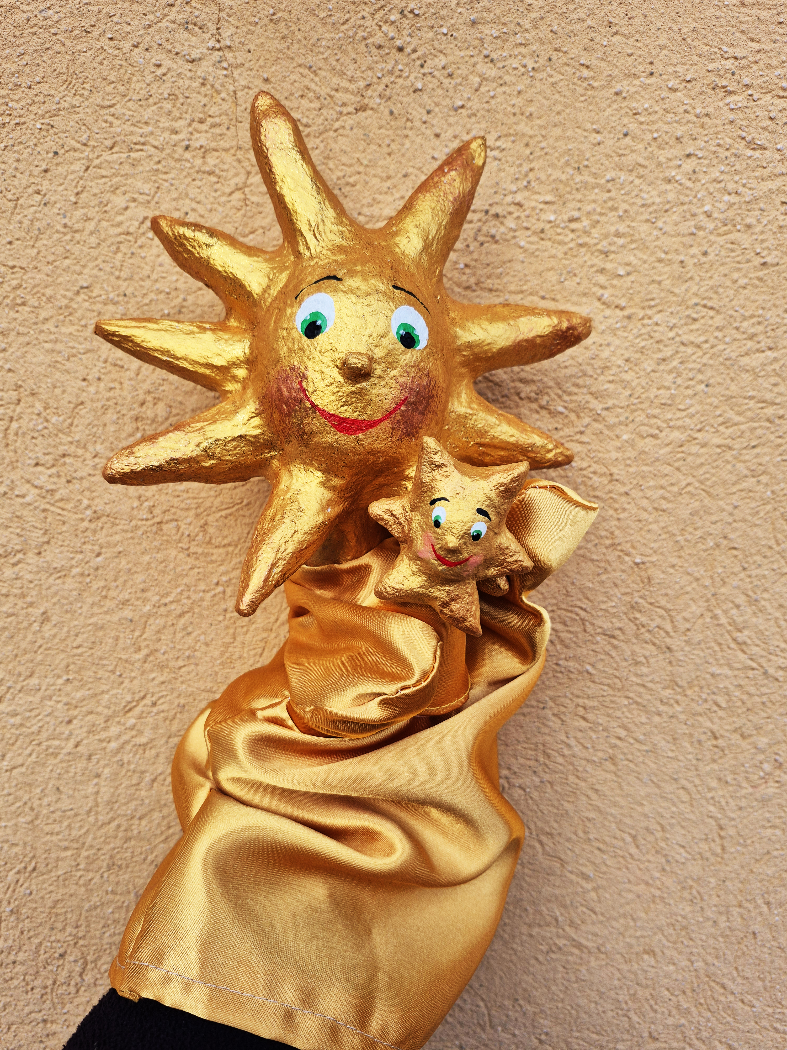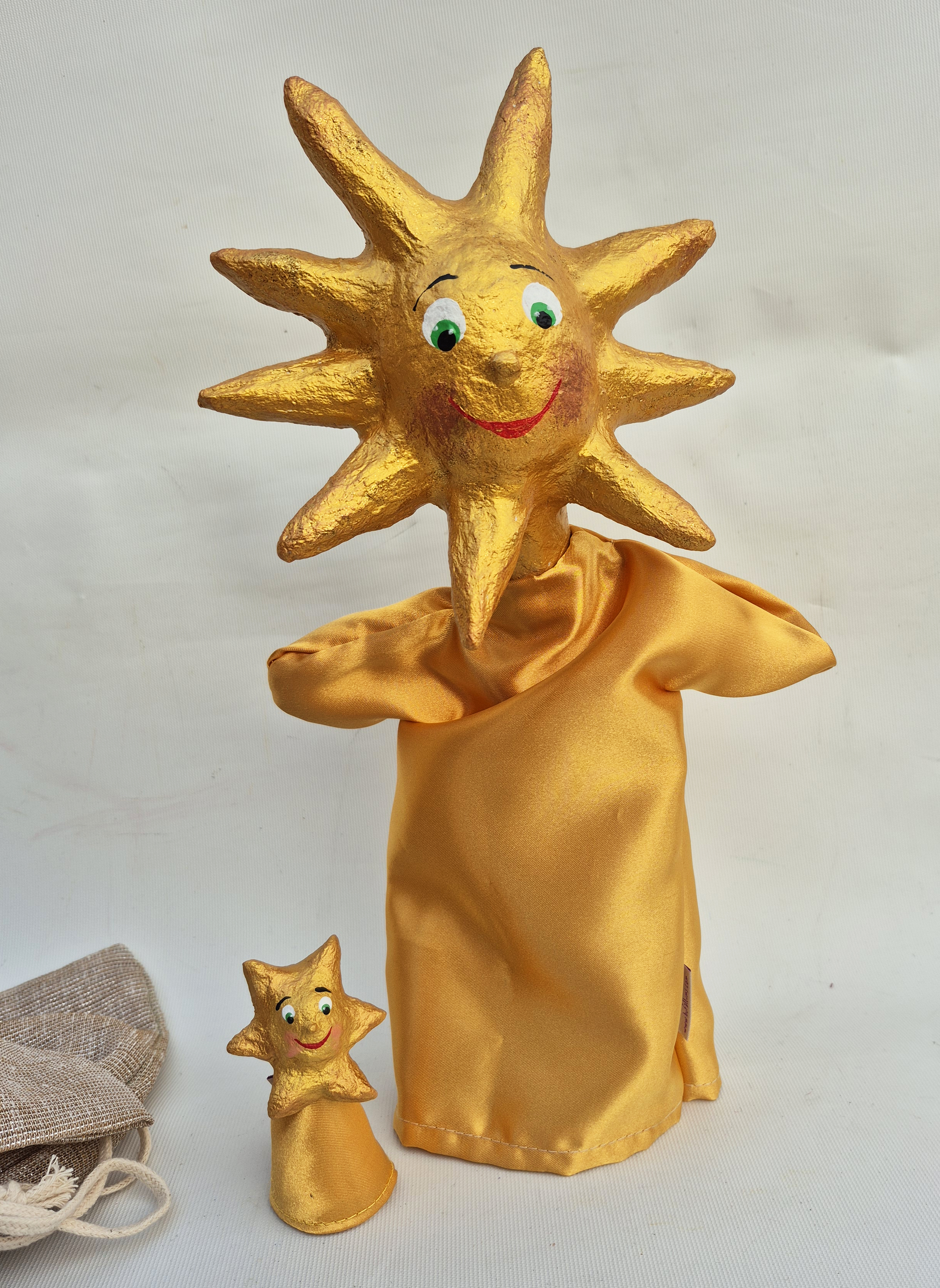 Este conjunto incluye 1 títere de mano Estrella (unos 30-35 cm aproximadamente) y 1 títere de dedo Estrella (unos 8 cm aproximadamente).