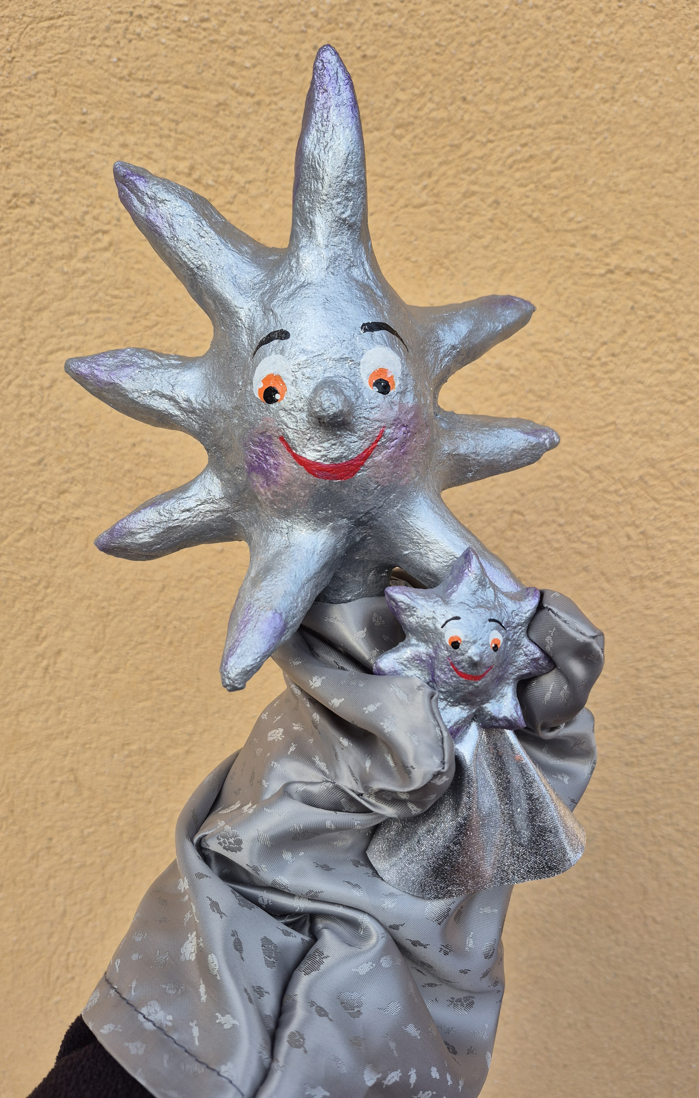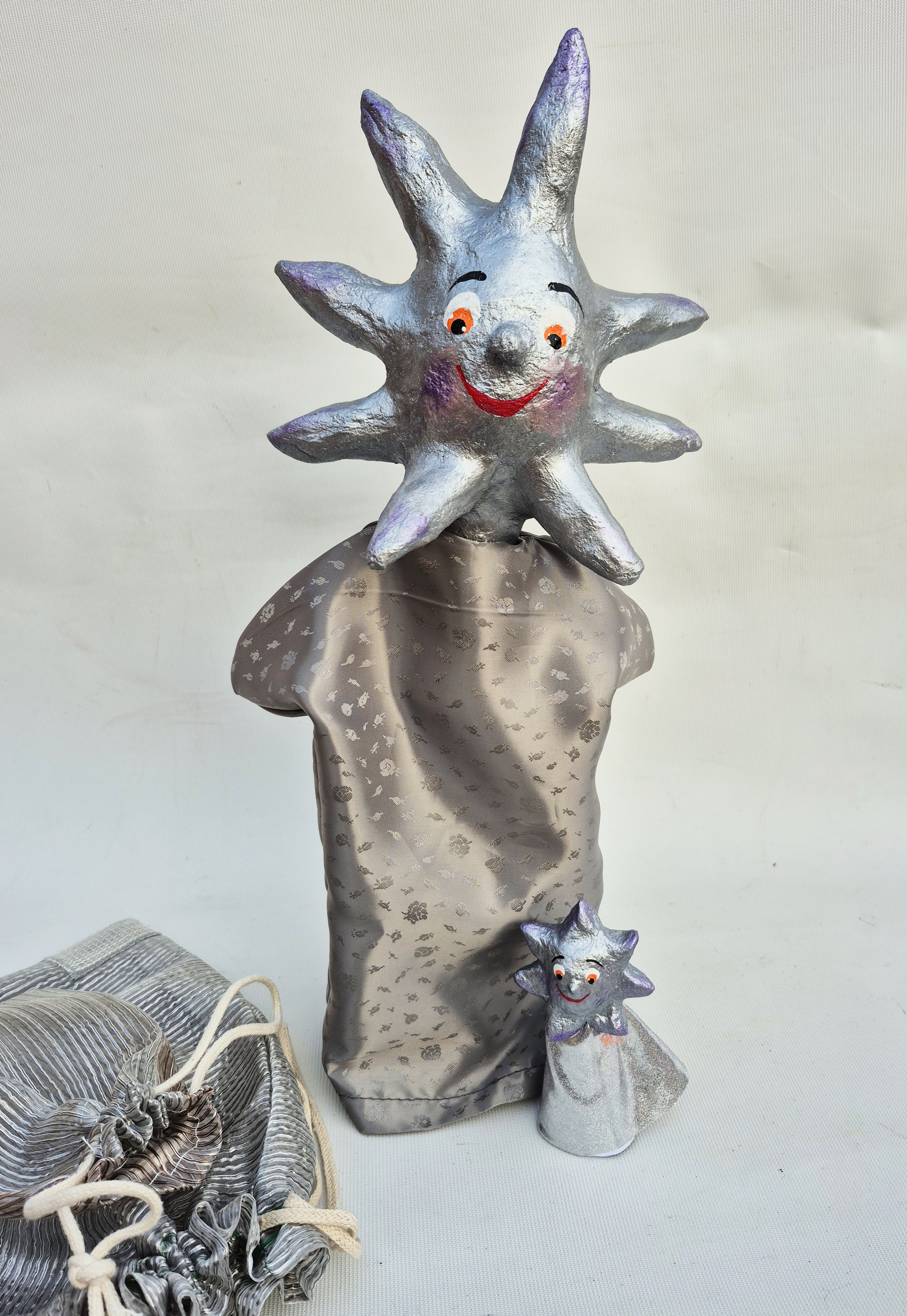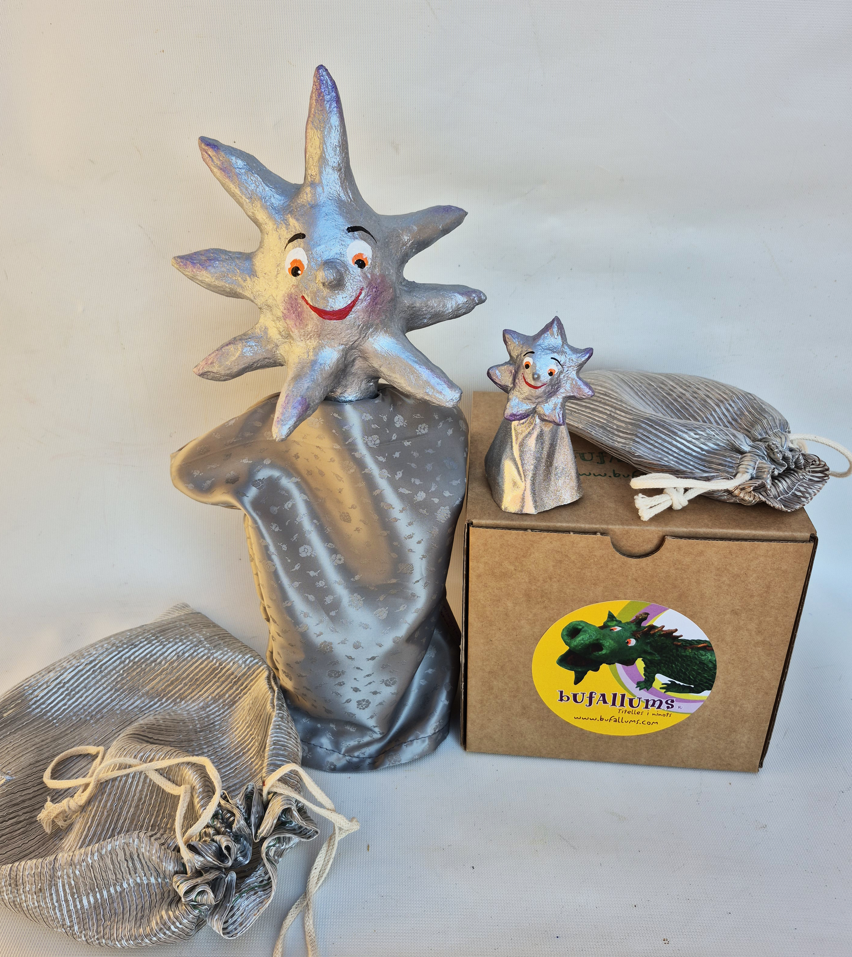 Este conjunto incluye 1 títere de mano Estrella (unos 30-35 cm aproximadamente) y 1 títere de dedo Estrella (unos 8 cm aproximadamente). Llevan un collar de cascabeles que les da un toque especial.