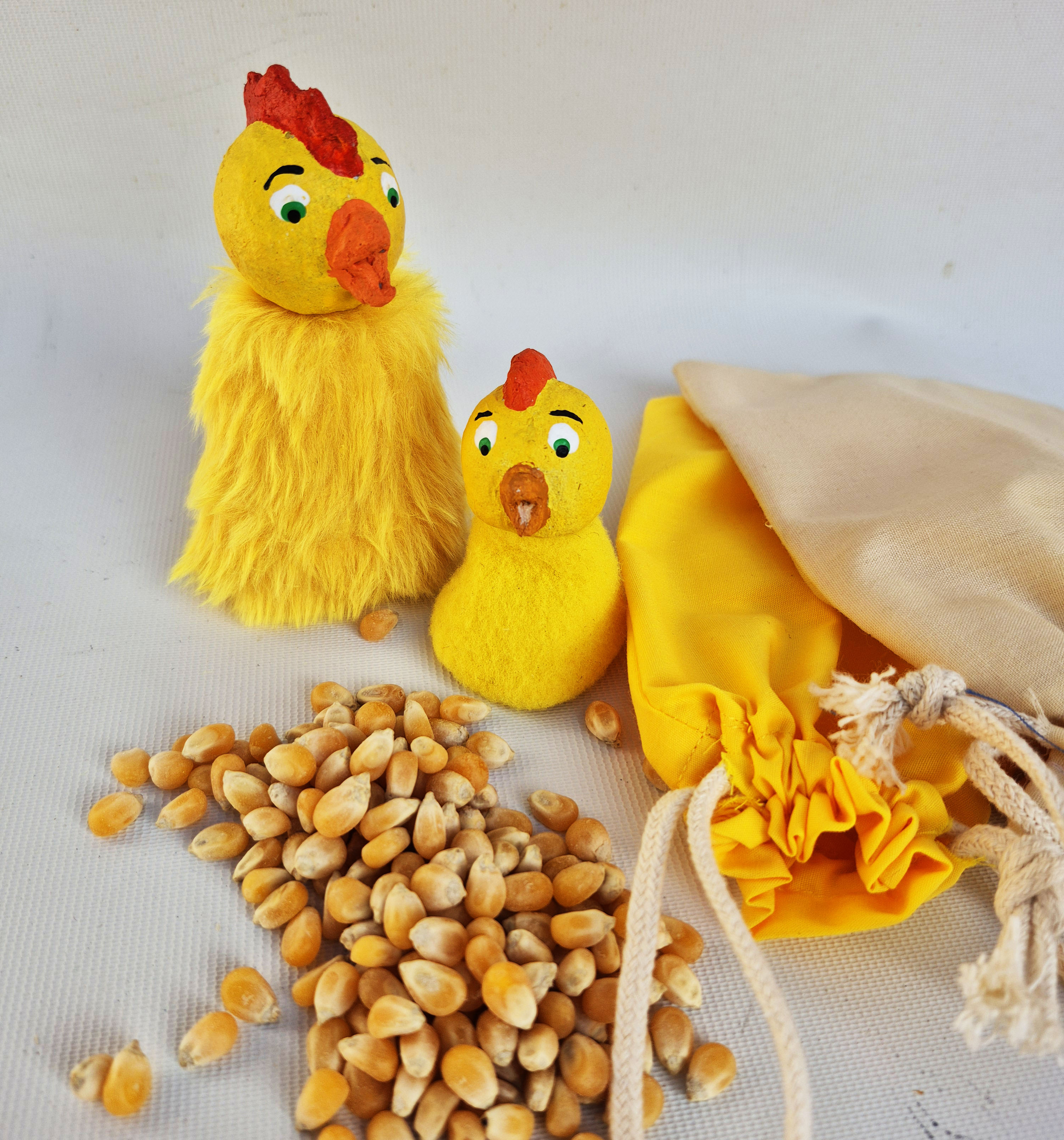 Este conjunto está inspirado en el cuento, pero los títeres no son réplicas literales. Mantienen su propia personalidad y se pueden adaptar a otras historias y juegos más allá del libro. El saquito de maíz permite recrear el crecimiento de Pepe y hacer que la historia salga del libro, añadiendo una capa de juego interactivo e imaginativo.