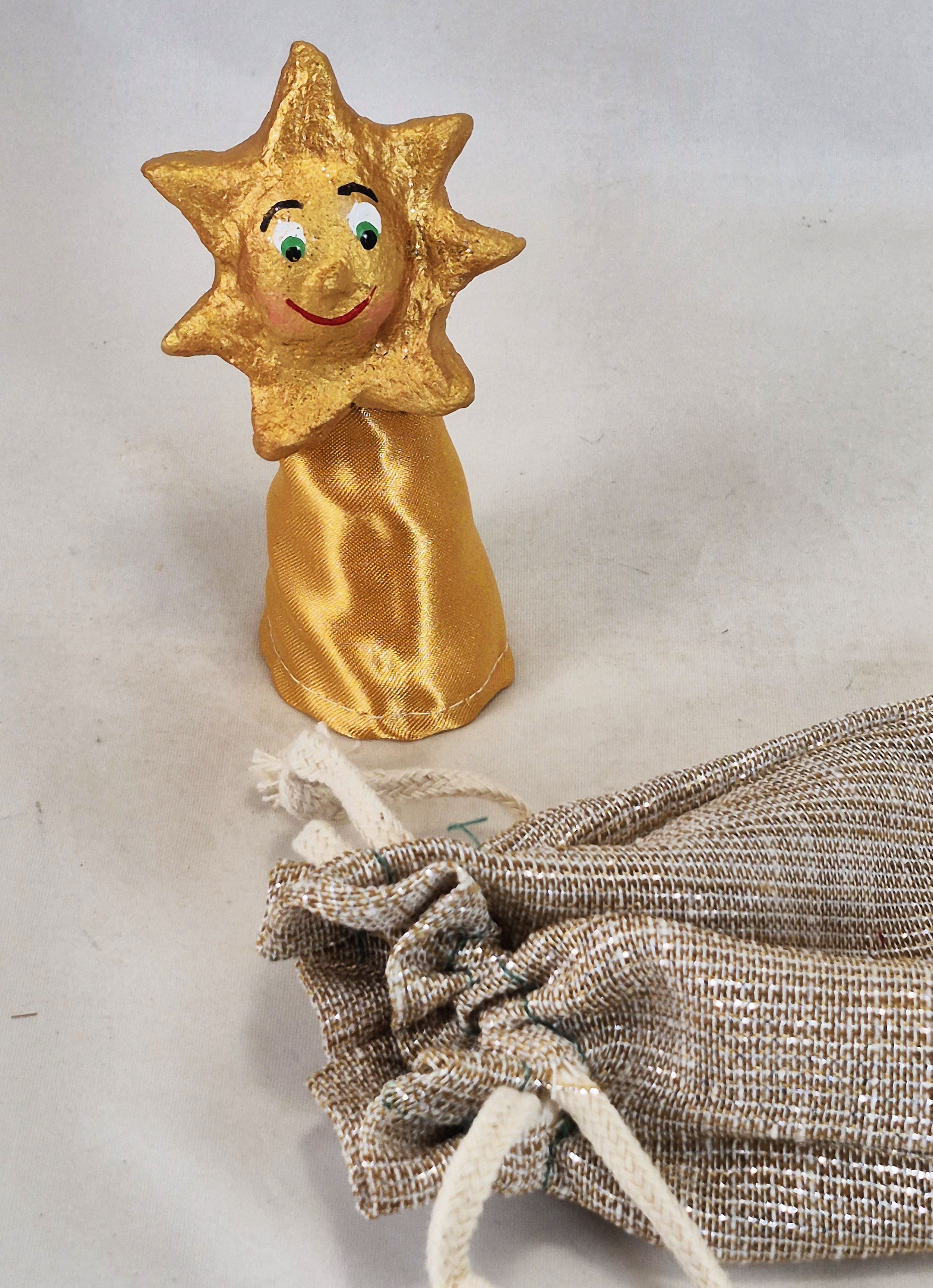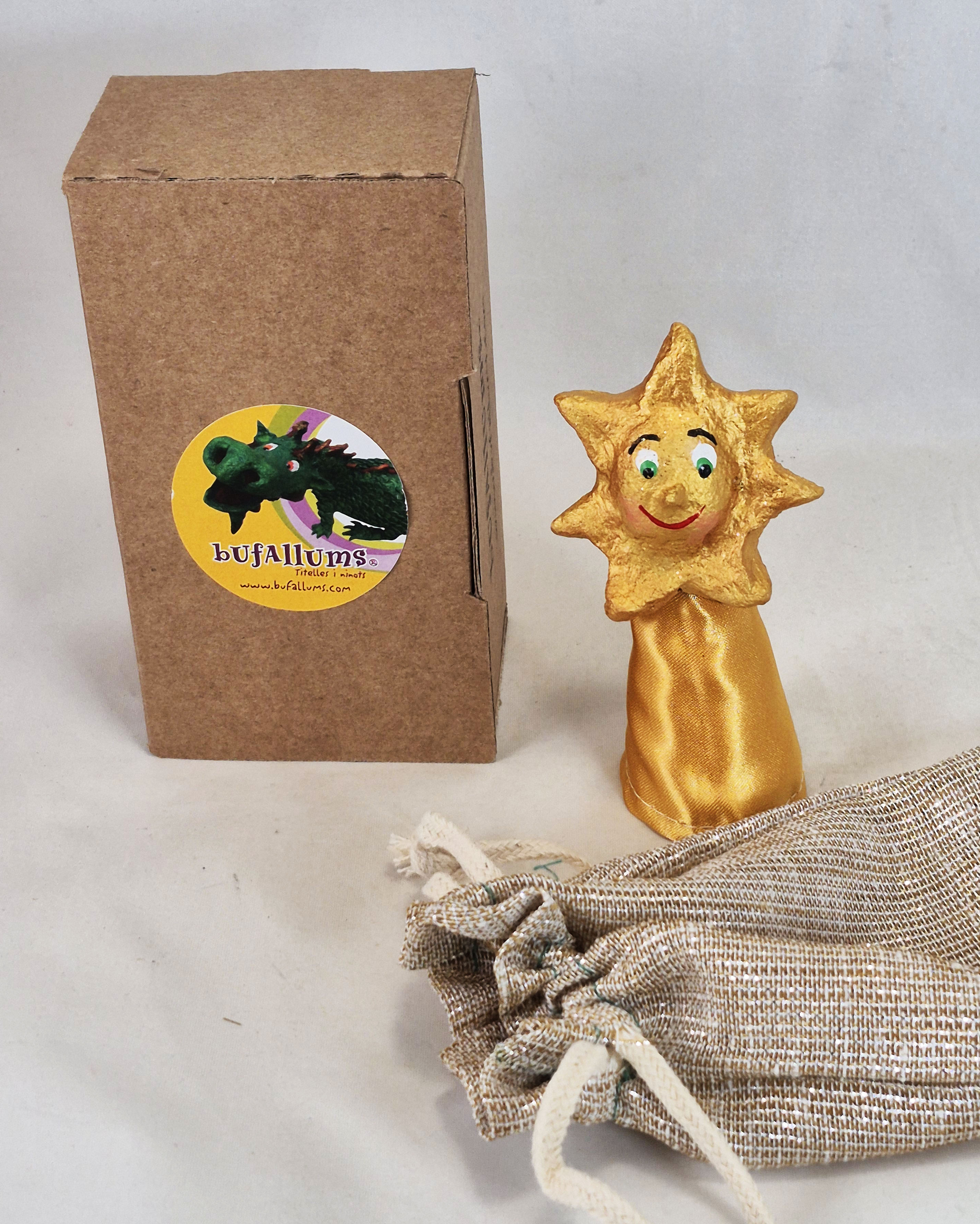 Este títere de dedo de una Estrella de aproximadamente 8 cm, es ideal para inventar historias divertidas y llenas de fantasía. Incluye una caja de cartón (7x14x5 cm) y una práctica bolsita de tela para guardarlo después de cada sesión de juego.