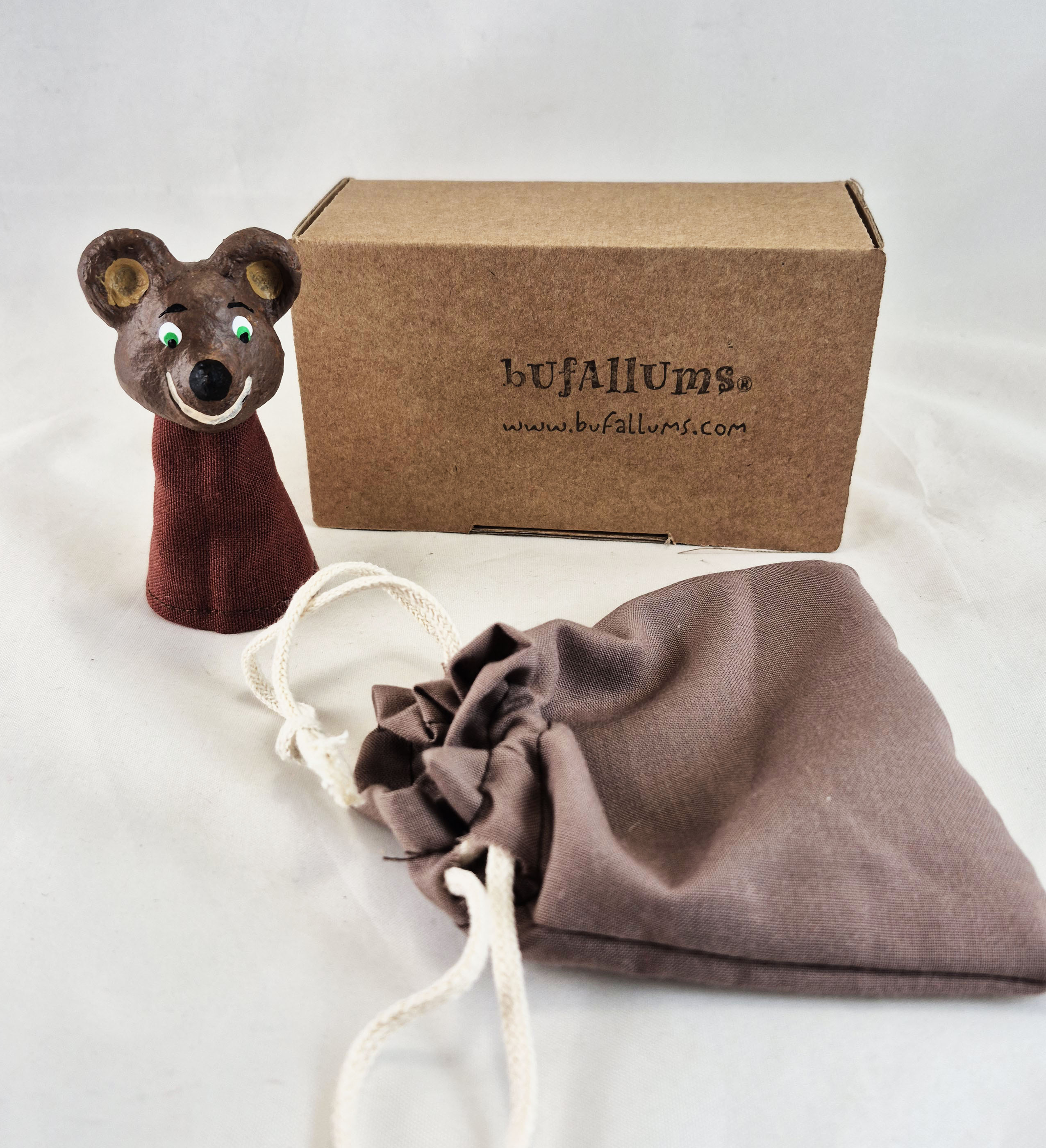 Cada pieza está moldeada a mano con pasta de papel elaborada con papel reutilizado, siguiendo la técnica artesanal propia de Bufallums. No se utilizan moldes, así que cada títere es único y puede presentar pequeñas variaciones respecto a la fotografía.