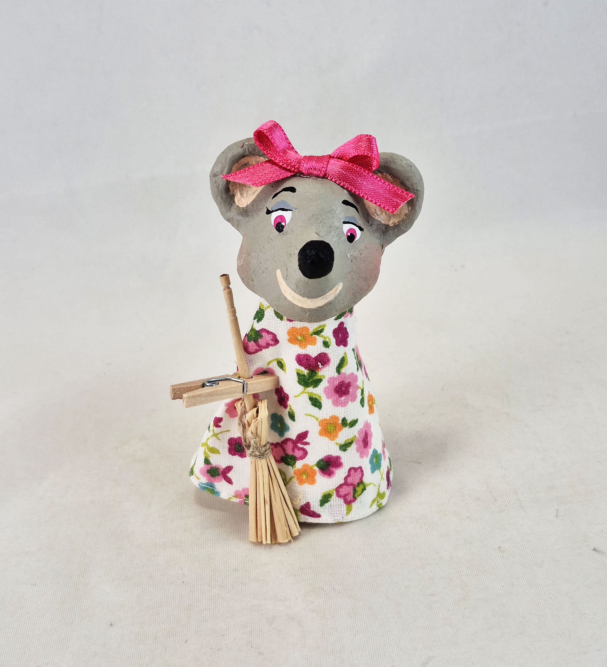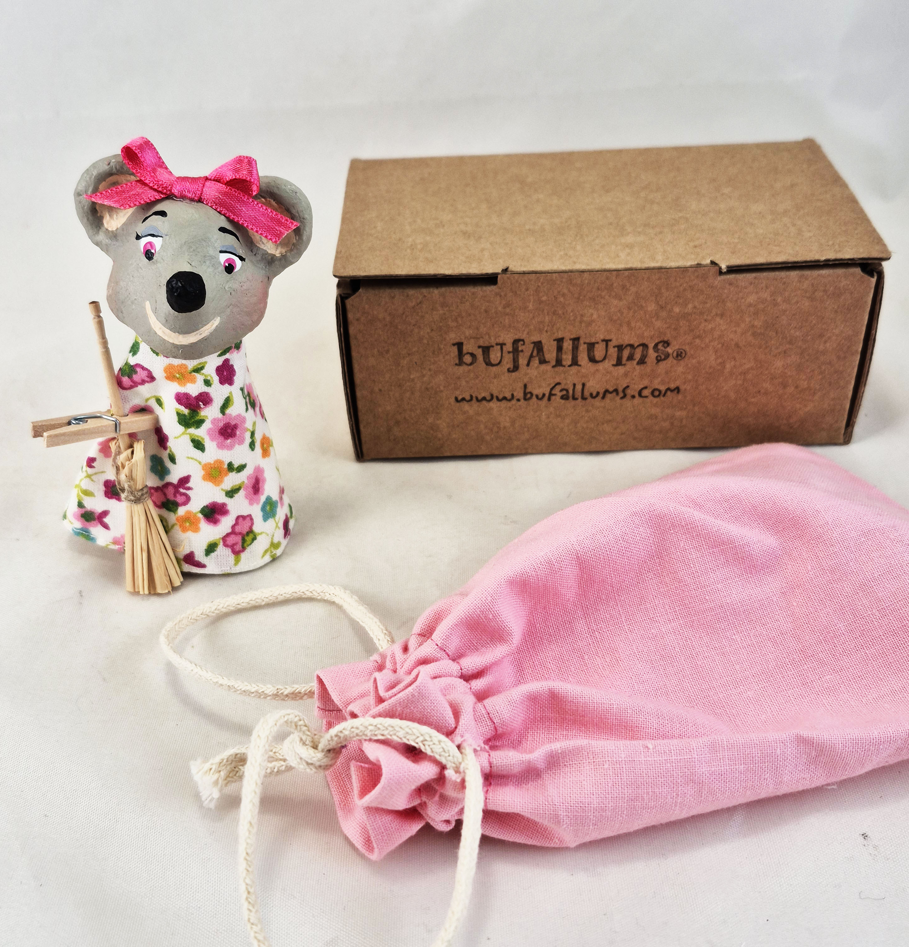 Títere de dedo de unos 7-8 cm aproximadamente. Incluye una cajita de cartón, la escoba y una bolsa de tela para guardarlo.