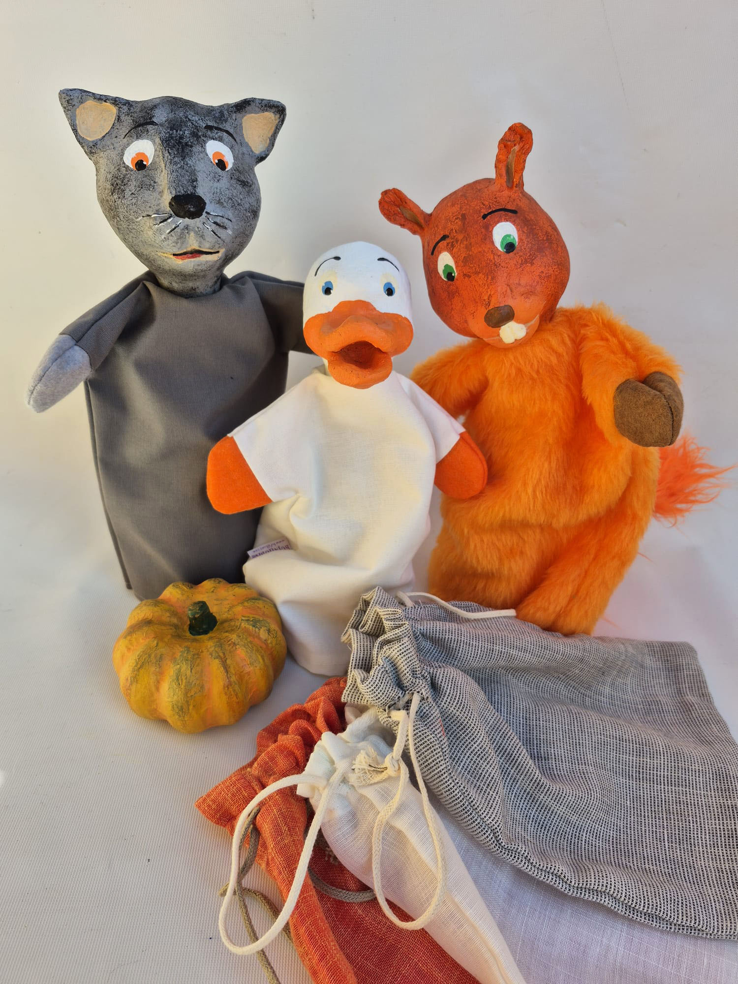 Este conjunto de 3 títeres de mano está inspirado en los entrañables personajes del cuento Sopa de Calabaza, publicado por la editorial Juventud. Son títeres elaborados artesanalmente, que evocan el encanto del cuento y, al mismo tiempo, dejan espacio para que cada personaje pueda participar en nuevas historias y juegos. Este cuento es rico en valores: habla de la amistad, las emociones, el respeto y, sobre todo, la importancia del trabajo en equipo.